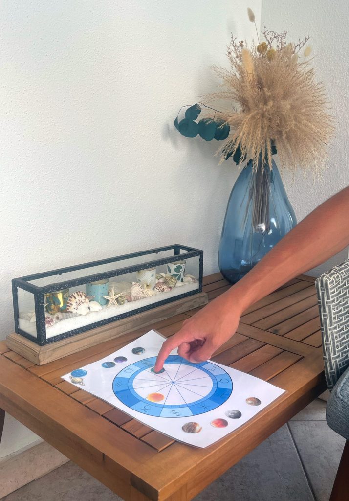 Nelle sessioni individuali (in presenza od online) utilizziamo una tavola astrologica con pedine colorate che rappresentano i pianeti, così da dare forma spaziale alle dodici energie zodiacali: questo permette di dare forma concreta ai movimenti interiori, trasformando l’astrologia in un’esperienza vissuta e tangibile.